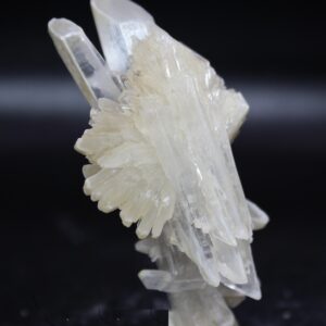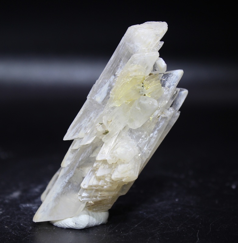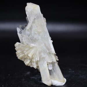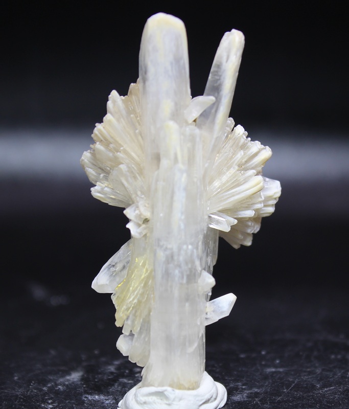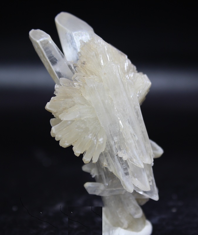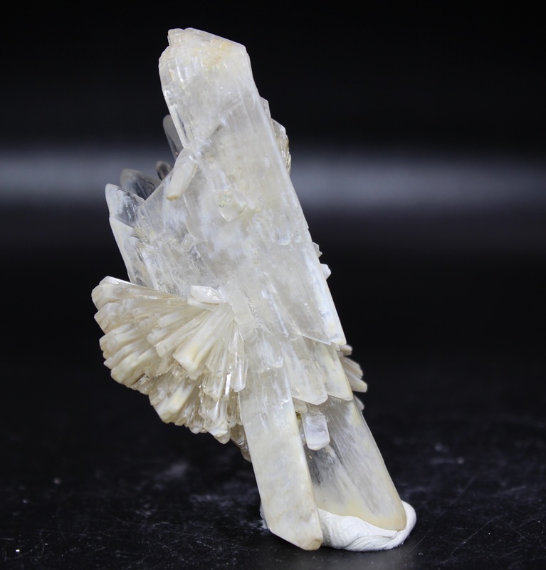 Die mannigfaltig ausgebildeten Gips-Kristalle von der Braunkohlen-Lagerstätte in Neuenhain sind vielen Sammlerm bekannt. Bei dieser wunderbaren Kristallgruppe ist der Hauptkristall auf einer Seite in zwei Teilkristalle aufgespalten, zusätzlich sind zahlreiche weitere Gips-Kriställchen seitlich angewachsen. Diese Kleinstufe ist ein mineralogisches Kleinod!