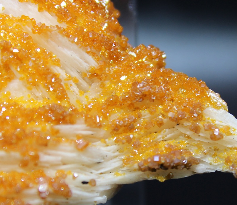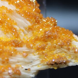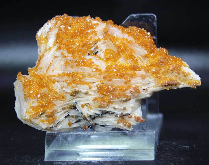 Wirklich ein Augenschmaus für Sammler – hochglänzende, orangefarbene Vanadinit-Kriställchen auf auf blättrigen Baryt. Teilweise findet sich Galenit auf dem Baryt. Die Maße dieser Handstufe sind 7×5,5×2 cm, das Gewicht ist 100 g.